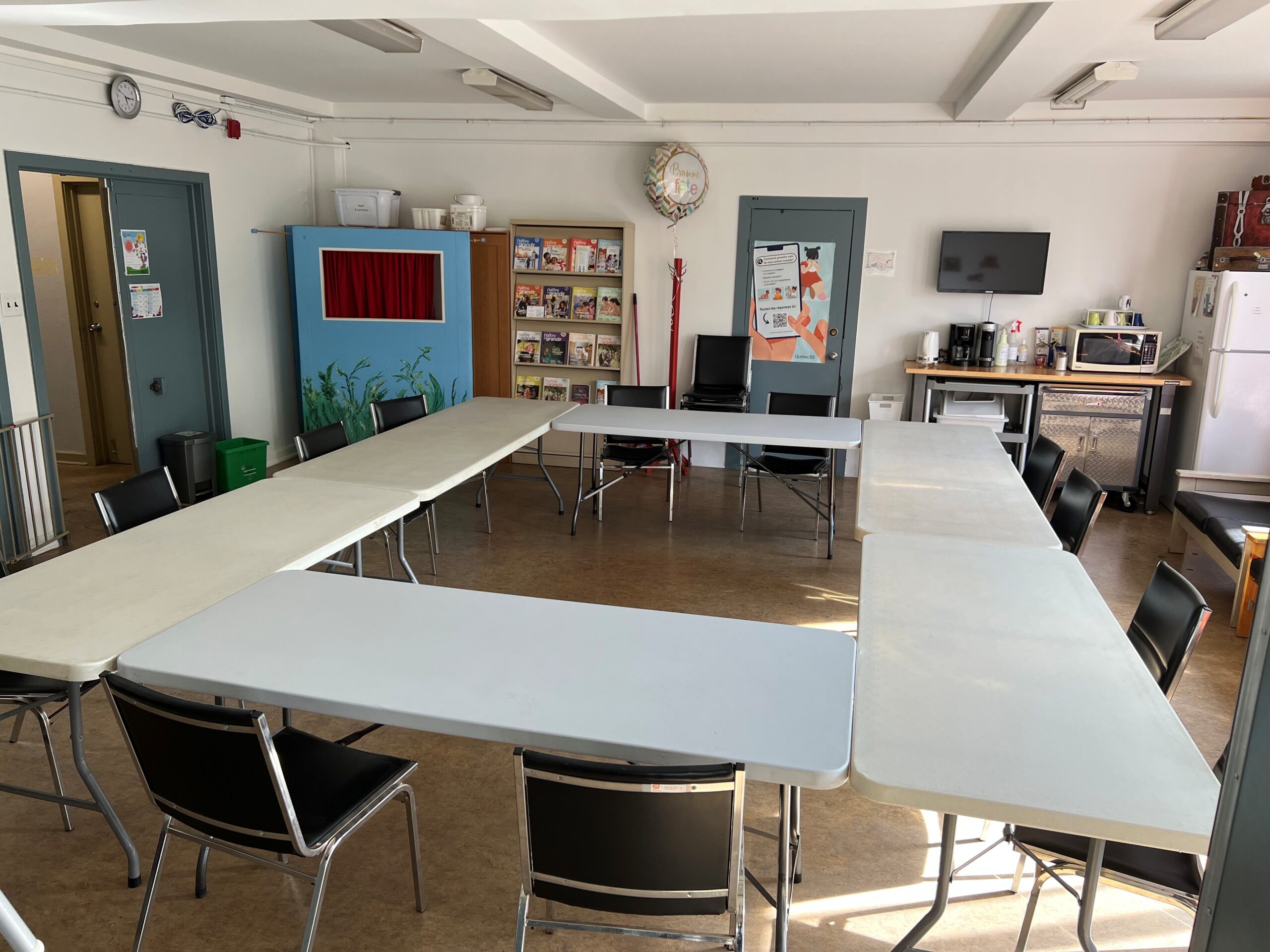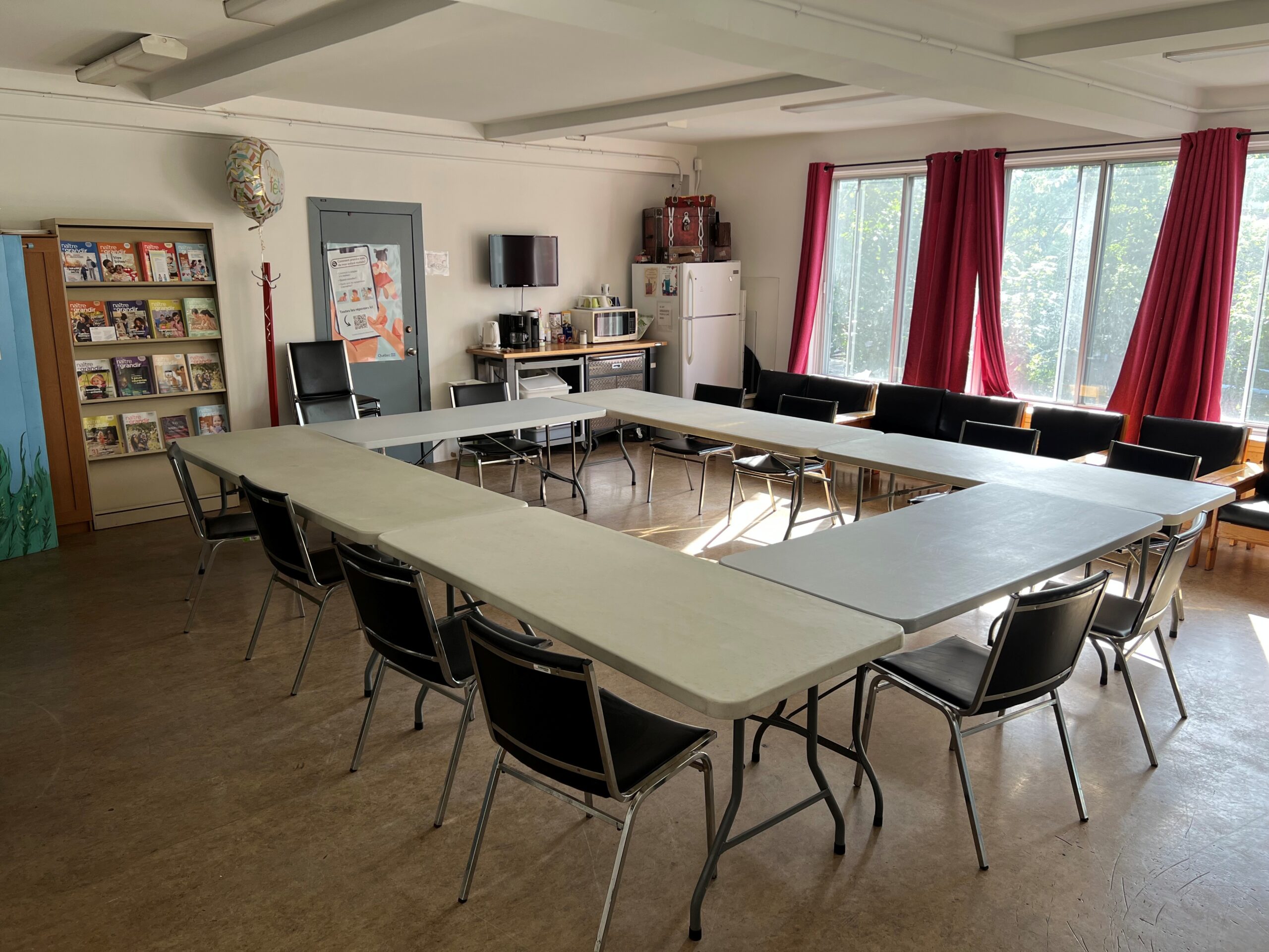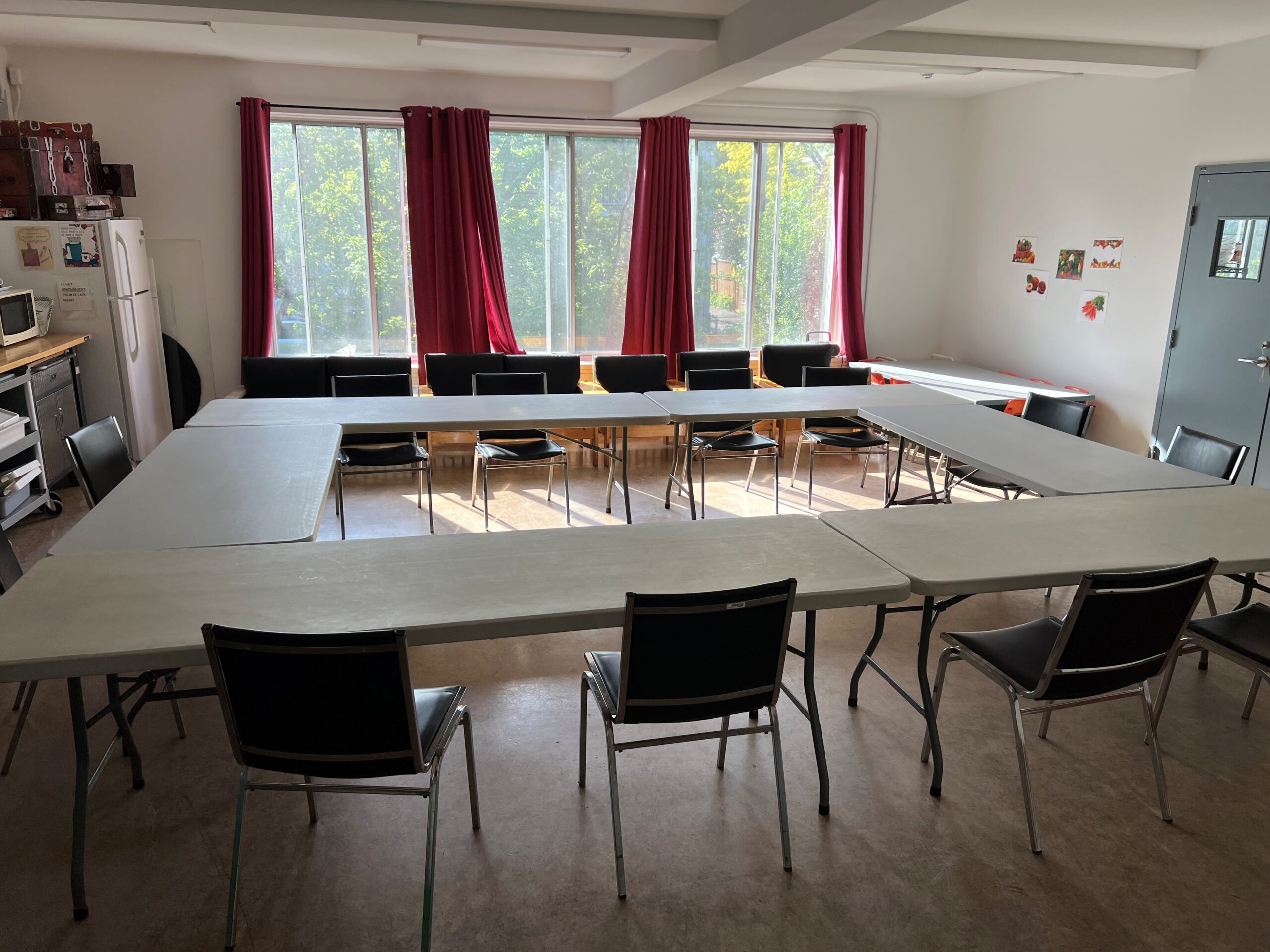 Salle située au deuxième étage avec grandes fenêtres donnant sur la cour, idéale pour les fêtes d’enfants ou réunions, notre local familles est maintenant disponible. Le local peut être ouvert sur la cuisine pour servir de salle à manger. Vous y trouverez également une table basse et des chaises pour enfants ainsi que des chaises hautes.