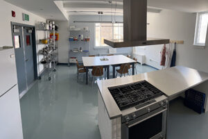 Salle située au deuxième étage avec grandes fenêtres donnant sur la cour, la cuisine équipée d’une cuisinière au gaz, hotte, lave-vaisselle commercial et tous les outils nécessaires est idéale pour des ateliers culinaires ou des soupers thématiques.